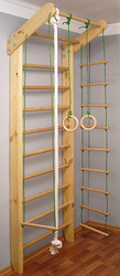 Состав спортивного уголка: шведская стенка с верхним турником, веревочный набор (кольца, канат, трапеция, веревочная лесенка), Габаритные размеры спортивного уголка: высота - 210 см, ширина: шведская стенка - 80см, верхний турник - 87см; выступ верхнего турника вперед - 60см; количество перекладин на шведской стенке - 9/10шт, на верхнем турнике - 2шт; Допустимые динамические нагрузки:перекладины: шведская стенка и верхний турник - 120кг, элементы веревочного набора - 60кг, Материал: боковины: шведская стенка и турник - сосна перекладины: шведская стенка, турники, веревочная лесенка и трапеция - бук кольца выточены из прочной водостойкой фанеры веревка в элементах веревочного набора - полипропилен канат (диаметр 22 мм) - хлопок.