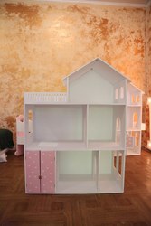 Размеры: 110см/90см; Высота и глубина этажа: 35см и 30см Материал: МДФ (фанера 10 мм) Уютный трехэтажный кукольный домик с балконом, гаражом и просторной террасой – желанный подарок для каждой маленькой девочки.